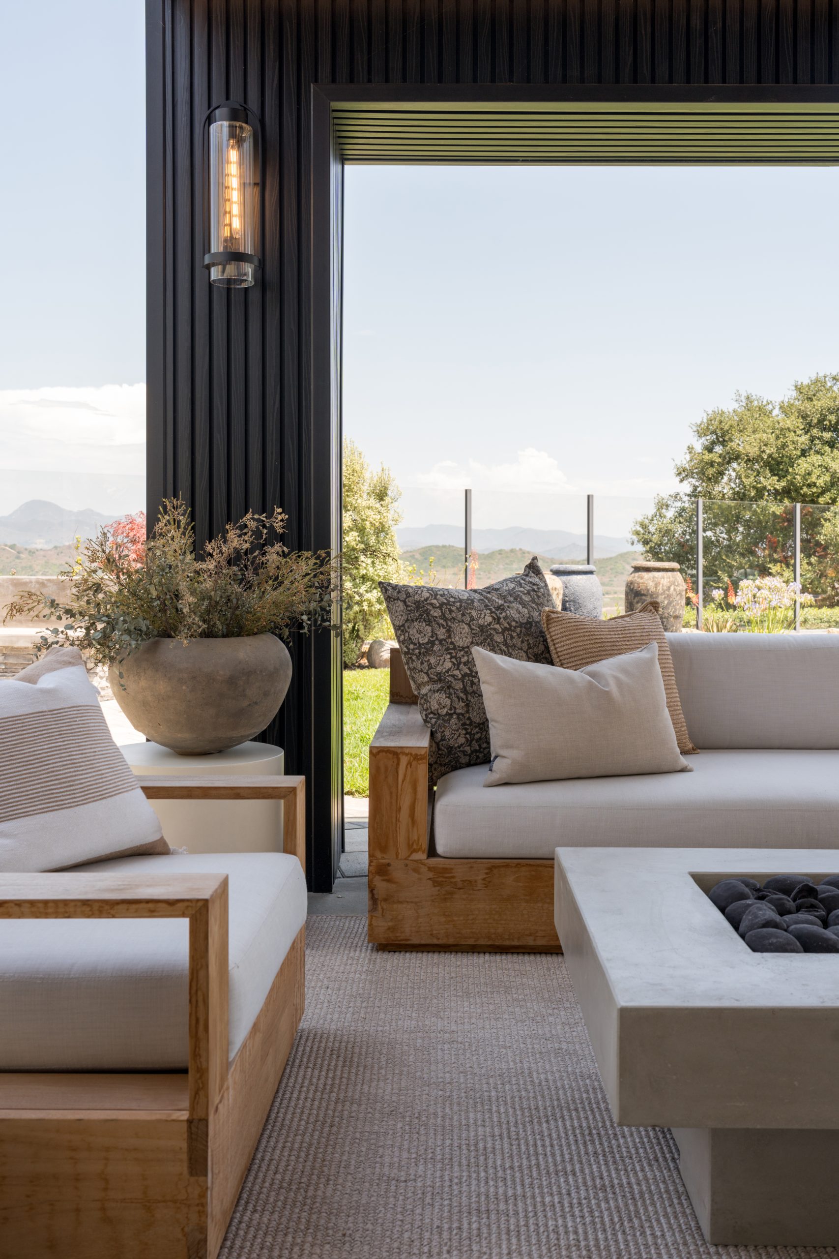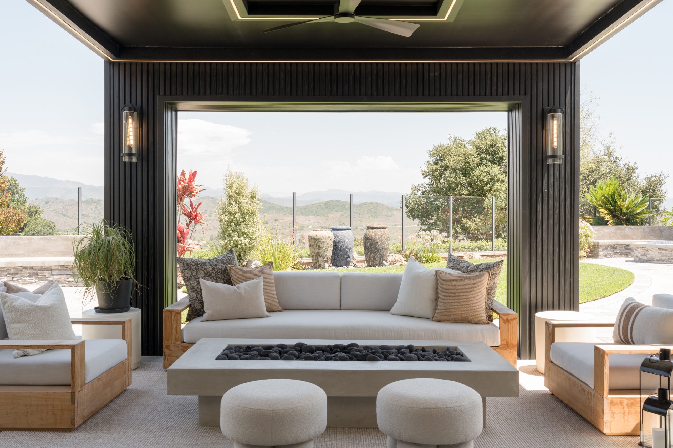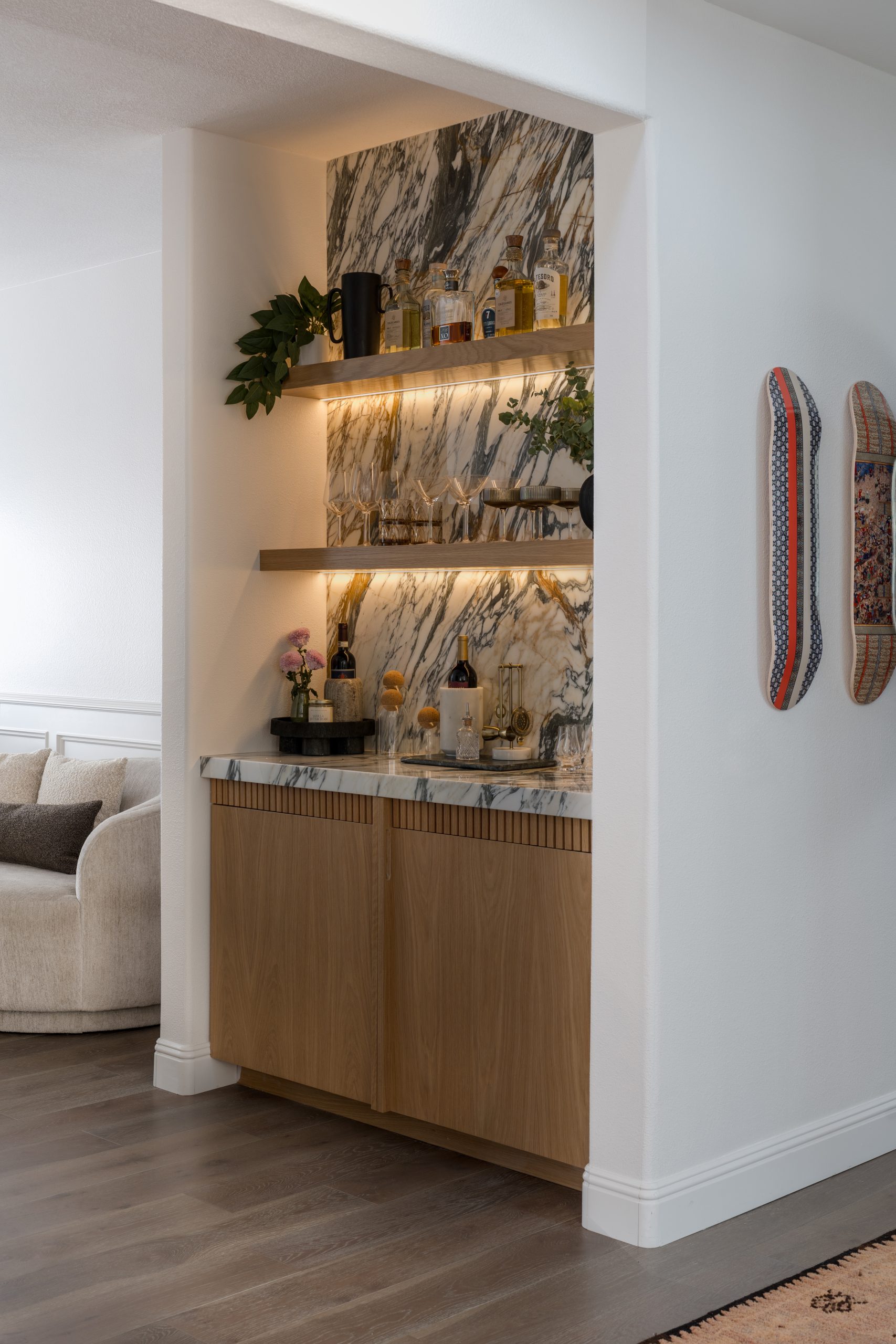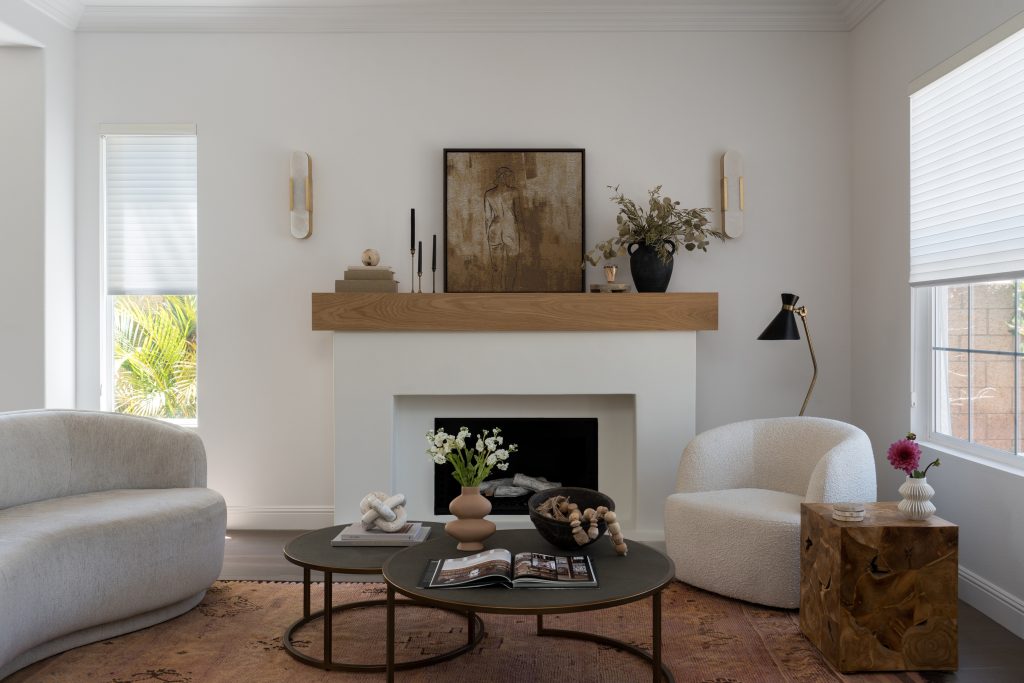 The Skyline Project holds a special place for us as it was our very first client—one that helped shape the foundation of our design journey. The goal was to transform a late-90s suburban tract home into a space that truly felt personal, layered, and intentional. With generous square footage to work with, we reimagined the main living area by removing the dated, centered fireplace and off-center built-in TV, replacing it with a clean, linear fireplace framed by a custom fluted wall treatment and concealed storage for a seamless, elevated look. The home was further opened to the outdoors by redesigning the exterior living space to flow effortlessly through a dramatic 23-foot sliding door, blurring the line between inside and out. Inside, we leaned into mood and function—adding depth to the powder bathroom, designing a compact yet highly functional bar, and bringing cohesion to the front living room fireplace—resulting in a home that feels warm, modern, and thoughtfully curated from front to back.