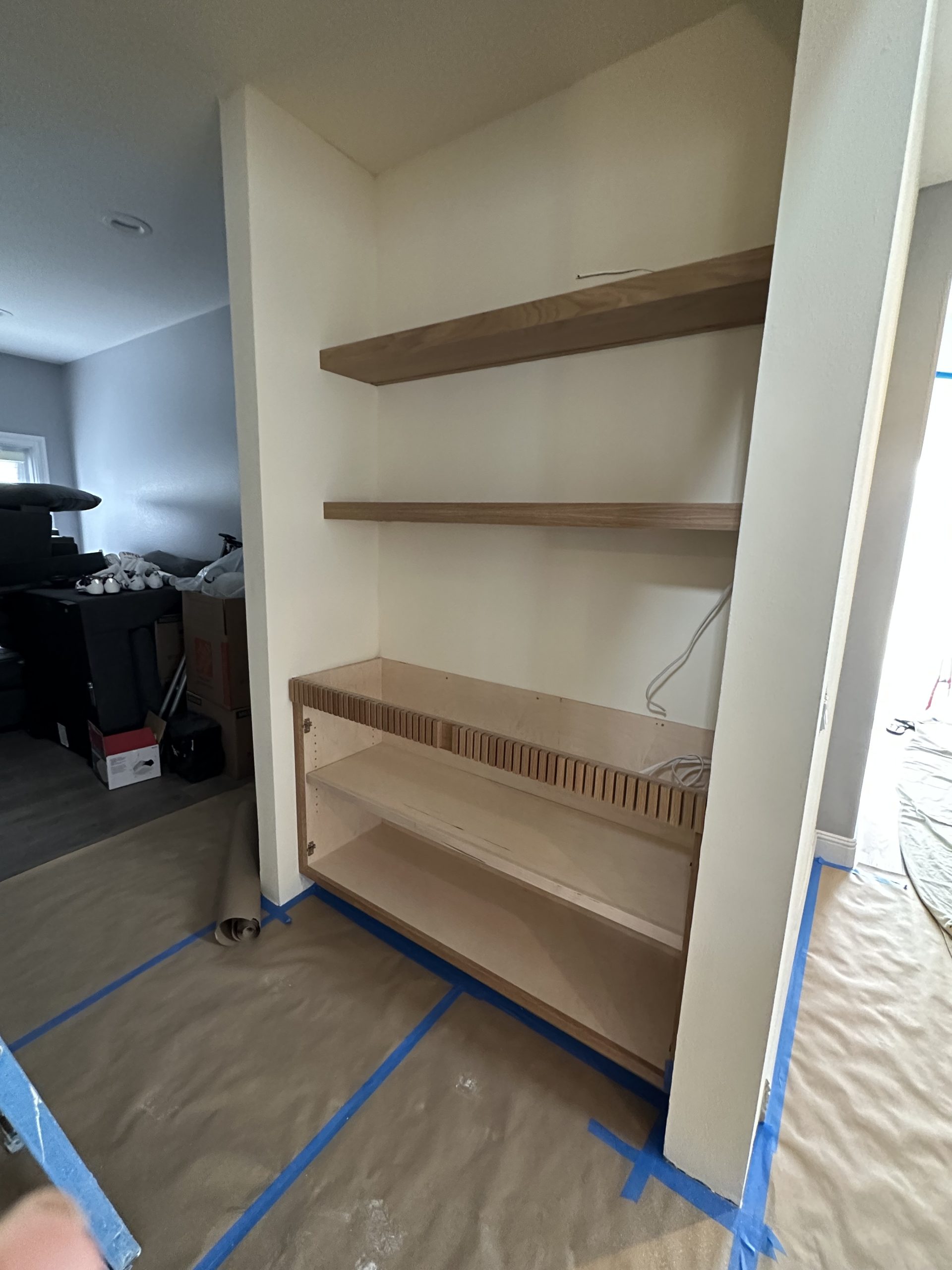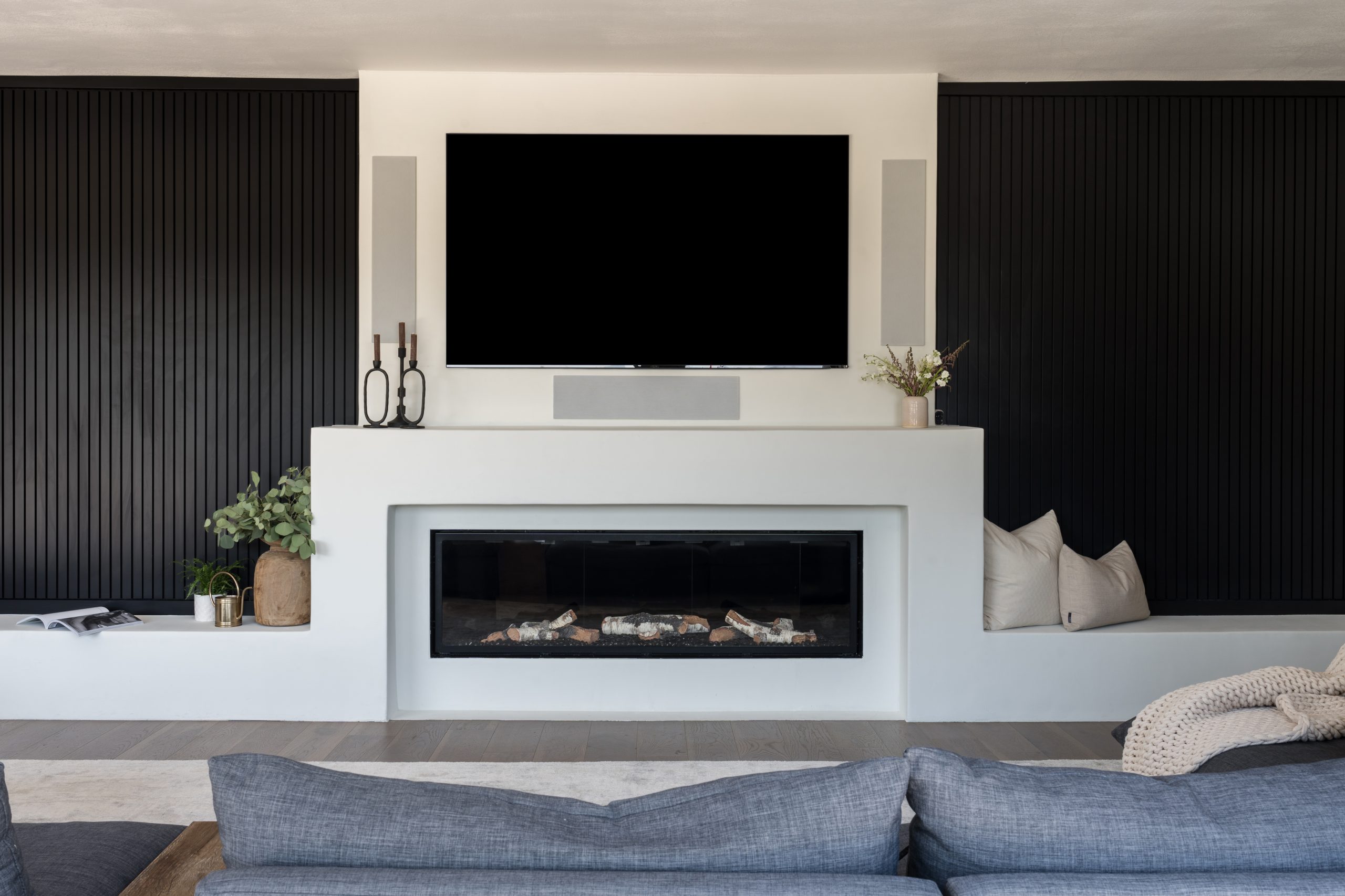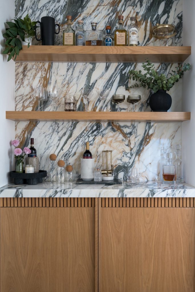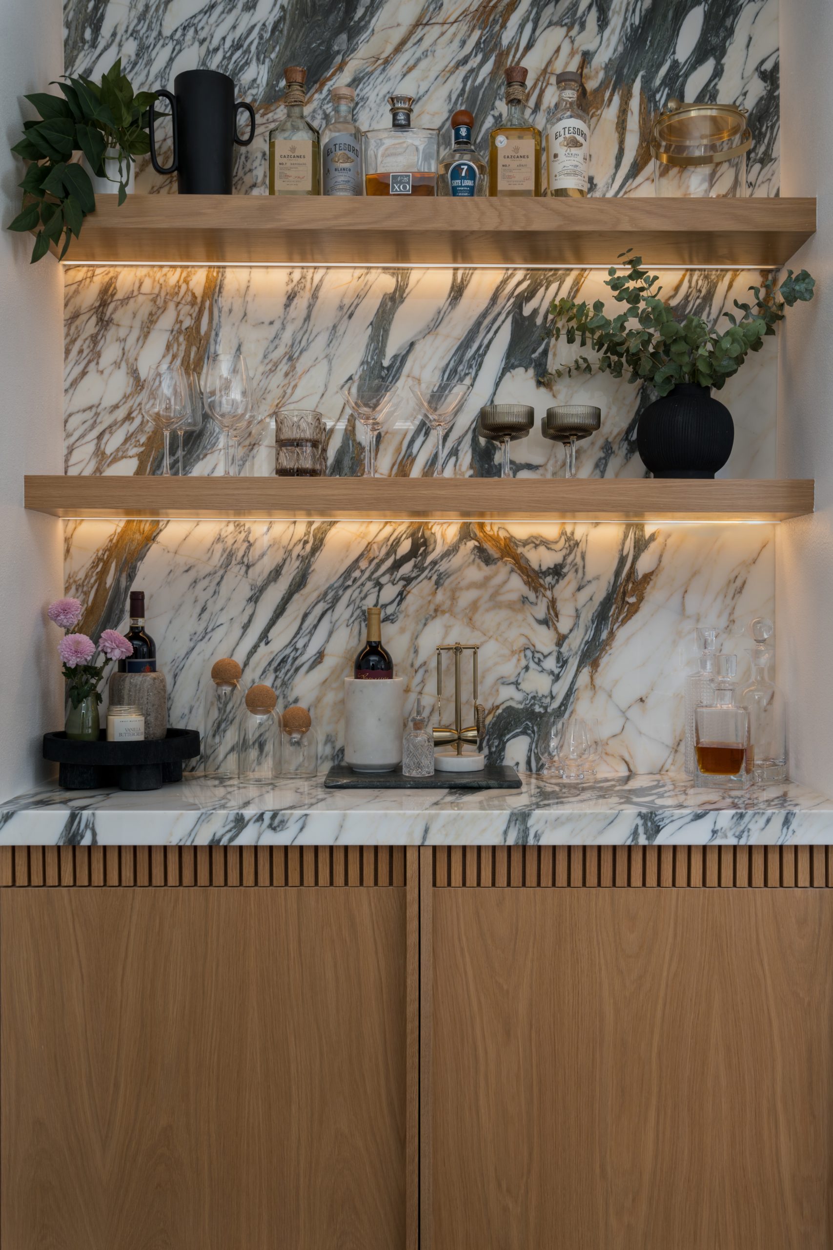 The Skyline Project holds a special place for us as it was our very first client—one that helped shape the foundation of our design journey. The goal was to transform a late-90s suburban tract home into a space that truly felt personal, layered, and intentional. With generous square footage to work with, we reimagined the main living area by removing the dated, centered fireplace and off-center built-in TV, replacing it with a clean, linear fireplace framed by a custom fluted wall treatment and concealed storage for a seamless, elevated look. The home was further opened to the outdoors by redesigning the exterior living space to flow effortlessly through a dramatic 23-foot sliding door, blurring the line between inside and out. Inside, we leaned into mood and function—adding depth to the powder bathroom, designing a compact yet highly functional bar, and bringing cohesion to the front living room fireplace—resulting in a home that feels warm, modern, and thoughtfully curated from front to back.
